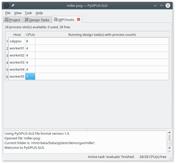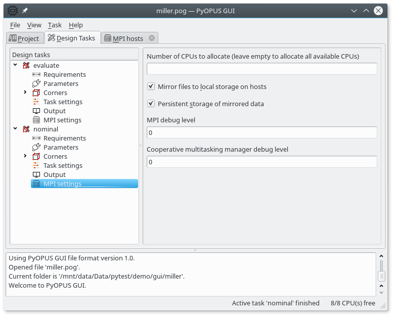 Enabling the “Persistent storage of mirrored data” option will force PyOPUS to create a local folder and mirror the files only once for every task execution. If disabled, a new local folder is created for every job that is outsourced by PyOPUS. This can be expensive and significantly slow down the optimization run. On the other hand, when experiencing problems, turn off this option. If the behavior improves you probably hit a bug in PyOPUS or have bad luck because PyOPUS reused an old local folder (this can happen if the remote task has the same PID as a task that was run in the past). To avoid the latter make sure the local storage is cleaned up when a host is started.