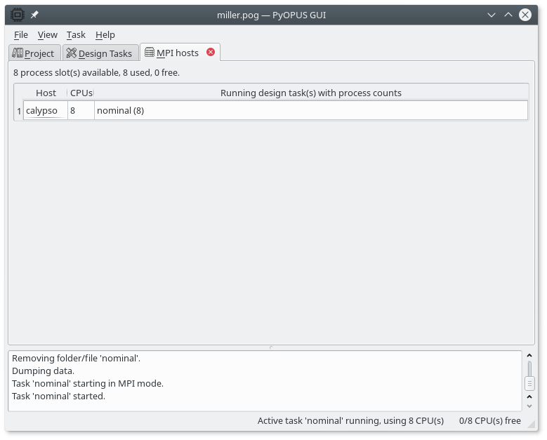 The active task is started in parallel mode by selecting Task/Start on cluster in the main menu. The overview of running tasks is available is the MPI hosts tab.