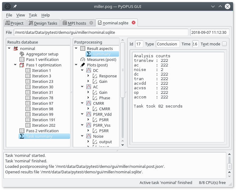 If we start the “nominal” task on 8 CPUs a typical results database looks like the above figure. We can see that the task took 82 seconds compared to 302 seconds on a single CPU. We can see that the optimizer evaluated a somewhat larger number of candidate circuits when it was using 8 CPUs. This is due to the fact that asynchronous parallel optimizers (like PSADE) can take a different path through the design space when run in parallel due to the indeterminate nature of communication delays. Nevertheless we obtained the result 3.7 times faster.