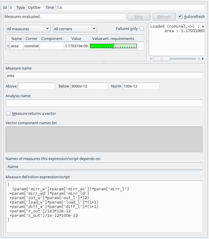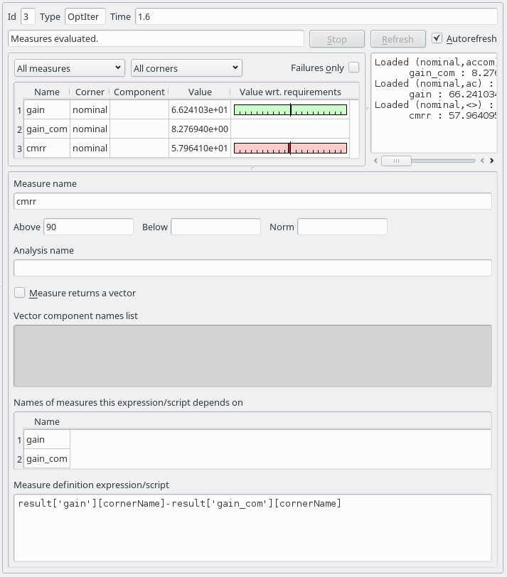 The middle part is dividen in two parts. The left part displays the values of performance measures in a table. Above the table are two selectors for filtering the displayed performace measure values according to the measure name and corner name. The “Failures only” checkbox limits the display to only those measure-corner pairs for which the performance measure fails to satisfy the requirements specified in its definition. The right part displays a log of measure evaluation. It can be used for debugging errors in performance measure definitions.
