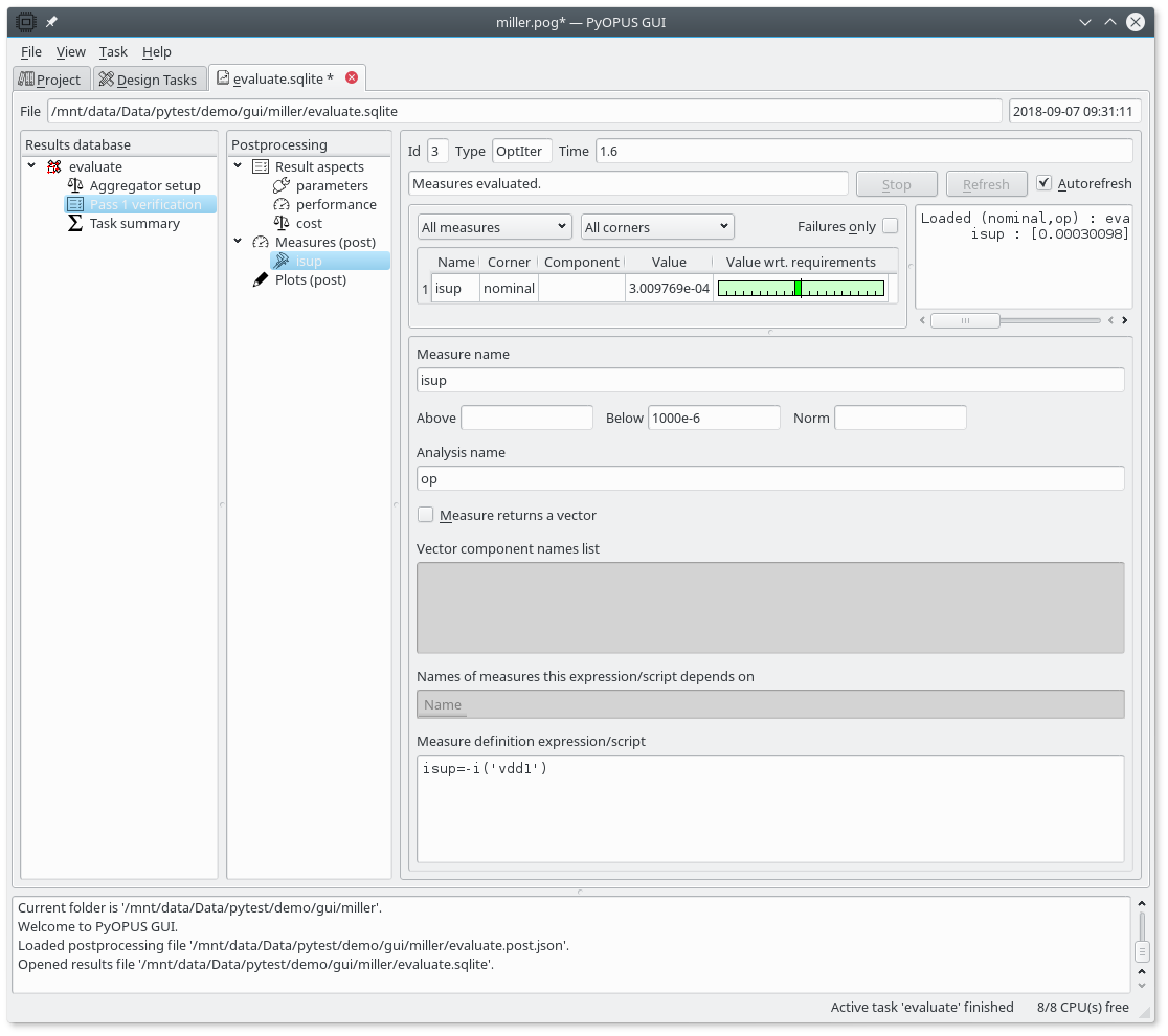 Measure definition expression/script - Pythonic expression specifying how the value of the performance measure is computed. See sections pyopus.evaluator.performance — System performance evaluation, pyopus.evaluator.measure — Performance measure extraction, and Miller opamp design with PyOPUS for more information.