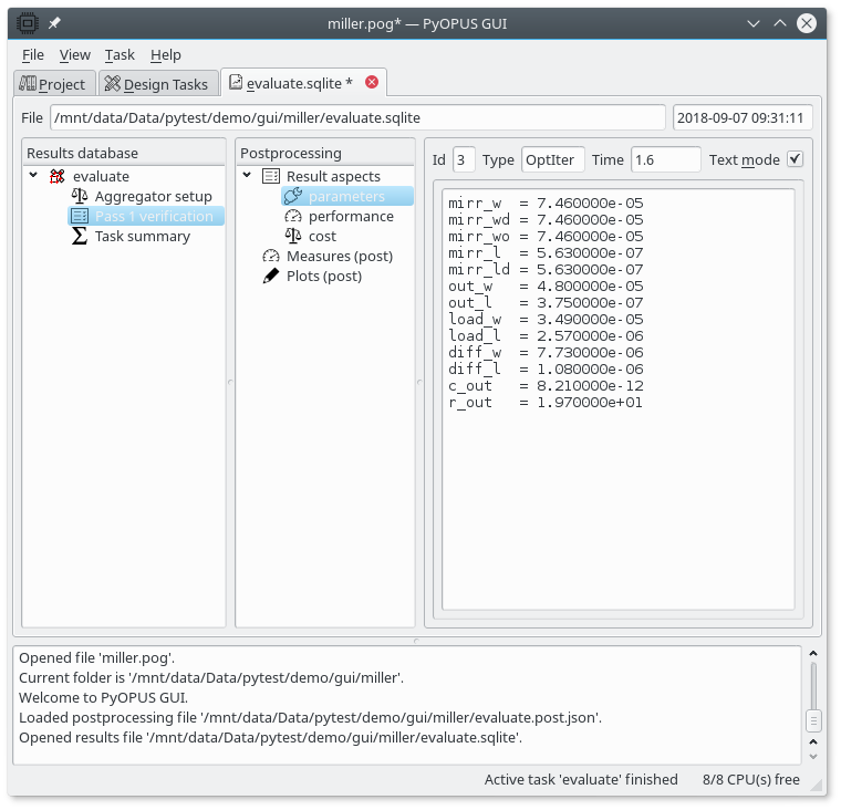 The “Pass 1 verification” node (which is an optimization iteration node) holds the actual results of the circuit evaluation. It has three aspects (parameters, performance, and cost). The performance and cost apects are empty because we did not define any performance measures is the project/task. The parameters aspect holds the values of the design parameters for which the circuit was evaluated.