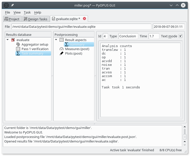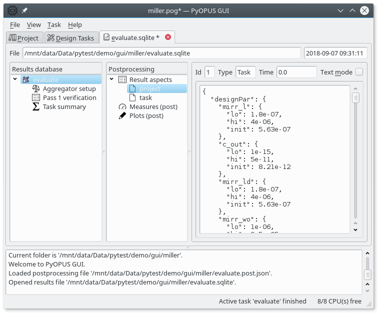 GUI displaying the results database of the simple evaluation task. The “evaluate” task node’s project aspect is displayed in the right half of the tab.