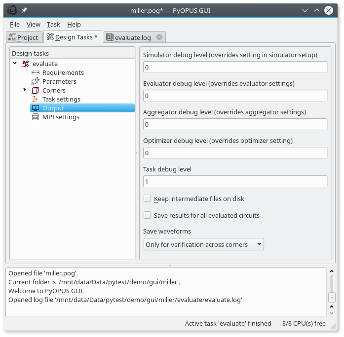 The first five settings specify the debug level of various PyOPUS modules. Level zero means no debug messages. Higher levels mean more verbose output. To debug the simulator with all its messages set the “Simulator debug level” to 3 or higher. Level 2 will print only the last few lines of the simulator’s output and level 1 prints only progress messages.