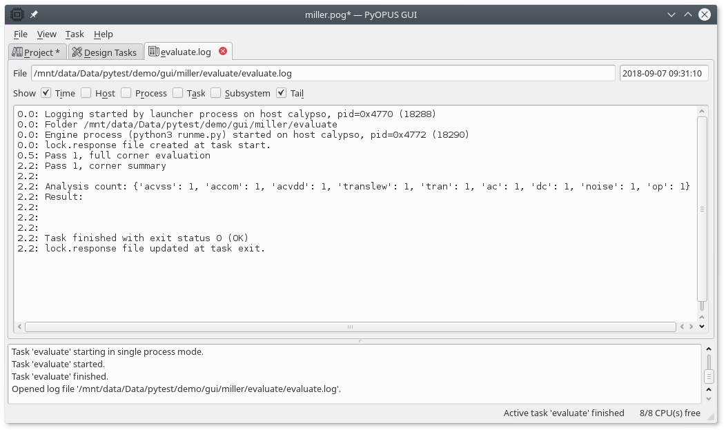The top of the log tab displays the path to the log file and the timepoint when the log was started (first entry). below are checkboxes for displaying various information on the log entries.