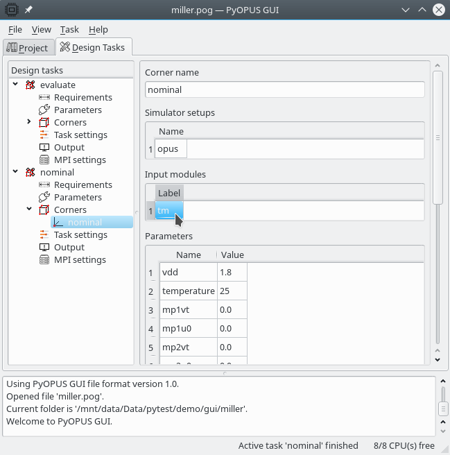 A corner named “nominal” was ustomatically added at task creation. It comprises nominal operating parameter values and zeros for statistical parameter values. We need to add the “tm” input module so that in this corner the typical MOS models will be used.
