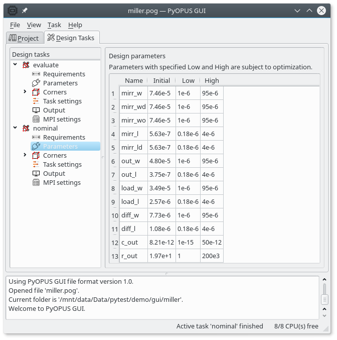 Go to the Design tasks tab and add a new task to the Design tasks tree. Name it “nominal” and expand the tree item. Select the Requirements subitem. For every performance measure defined in the project a requirement is added automatically by copying the Above/Below/Norm fields. A checkbox is available for every requirement. If it is checked the optimizer will try to satisfy the design requirement. Unchecked requirements are also evaluated during optimization, but they are not affect the optimizer’s choice of design parameters. Because we are going to design the circuit to satisfy the design requirements arising from DC and AC analyses, uncheck requirements overshdn, overshup, tsetdn, tsetup, slewdn, slewup, onoise1k, inoise1k, in1kmn2id, in1kmn2rd, and in1kmn2.